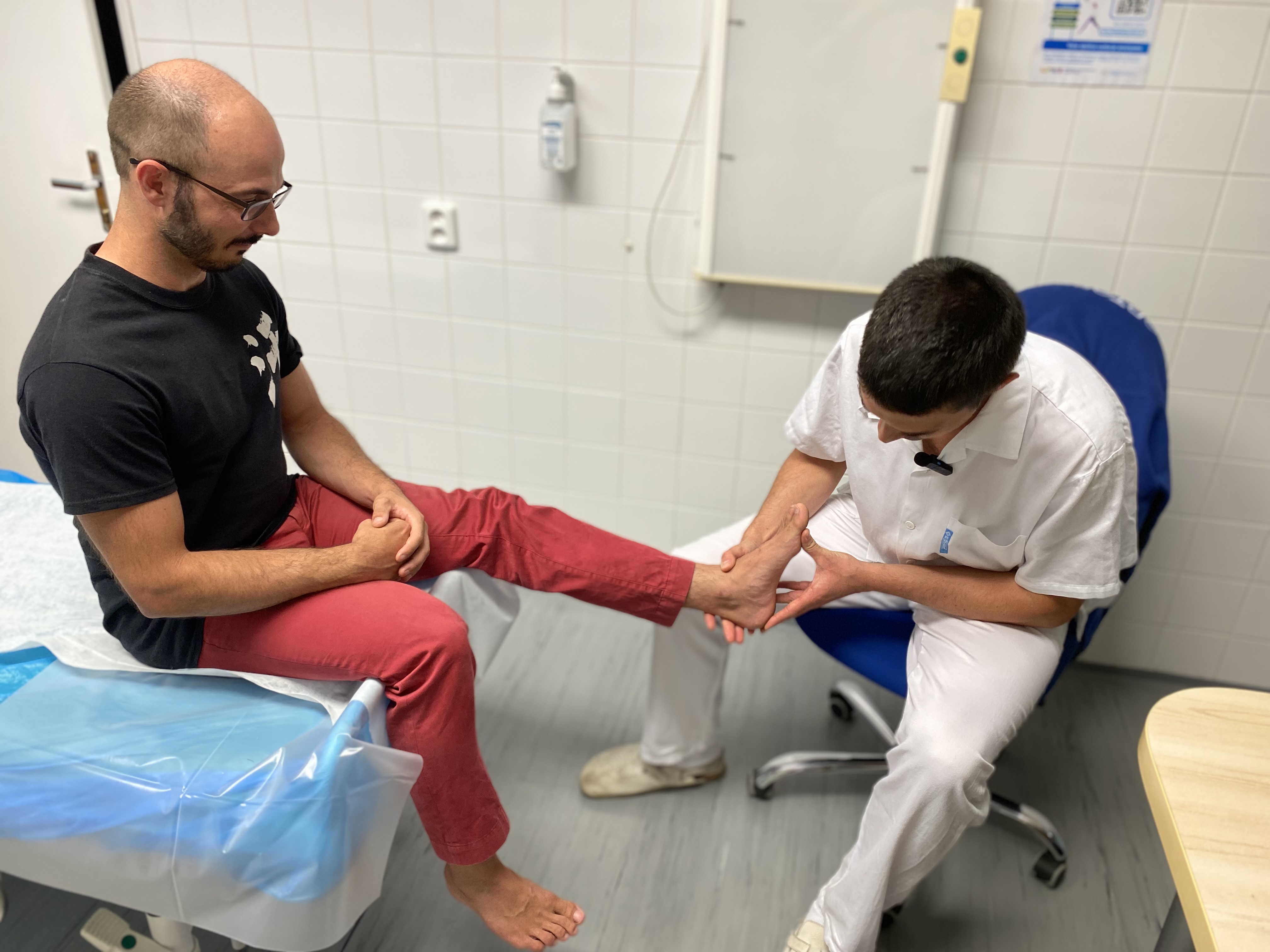Pak už přichází na řadu fyziologické vyšetření ve stoje, při chůzi i vleže. Lékař se zajímá třeba o takzvanou osu paty – u Lukáše nijak nevybočuje. Ortoped prohlíží také chodidla, všímá si mozolu a toho, že má pacient rozšířené přednoží. U lidí nosících boty jde noha obvykle do špičky, u Lukáše do šířky. Ale to může být částečně vrozené.