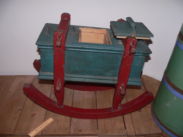 A tím vynalézavost našich předků nekončí. „Ještě důmyslnější byla dětská máselnice, která byla rovná a nahoře měla sedátko. Vpředu byl umístěn kolík na držení. Dítě se na ní houpalo a zároveň stloukalo máslo,“ popisuje má průvodkyně.