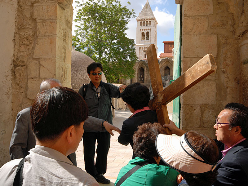 Po jeruzalémské Křížové cestě se s modlitbou na rtech pomalu posouvá skupina katolických poutníků z Jižní Koreje. Některým ženám stékají po tvářích slzy, jiní Korejci si zaznamenávají silné okamžiky fotoaparátem. Všichni ale mají jedno společné: pronajali si dřevěný kříž a každý ho po Via Dolorosa aspoň chvíli ponese.