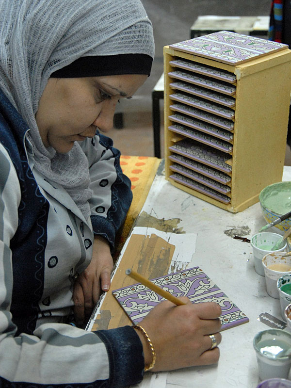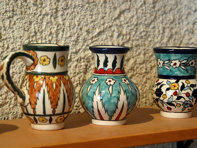 "Máme čtyři paní na ruční malování a dva muže, kteří pracují s kaolínem a u pecí. Jsou to všechno Palestinci. Pak jsem tady už jenom já. Moje matka je rodinná výtvarnice, ale už je jí 85, tak už spíš odpočívá a dochází tak jednou za týden," popisuje složení firmy.