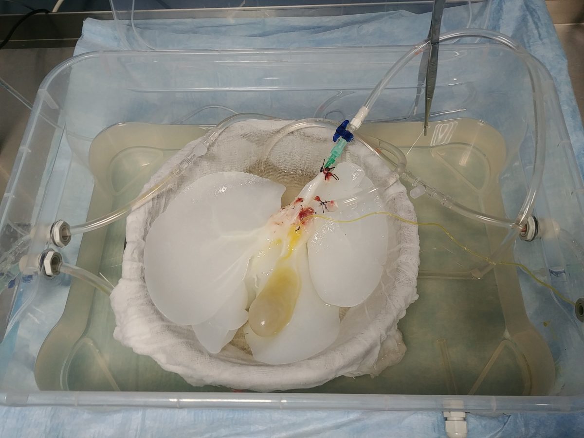 Zvířecí orgán napojila na umělé cévy a místo krve teď hadičkami protékají speciální roztoky, které odstraňují prasečí buňky. „Játra promýváme žílou, kterou roztok vtéká dovnitř. Máme napojenou i tepnu, to je tady ta červená spojka, a roztok odtéká ven druhou žílou,“ popisuje.