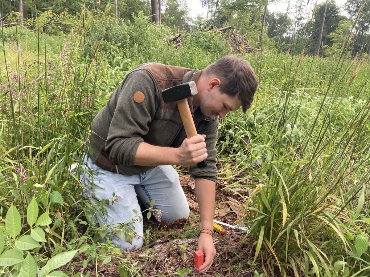 O pár set metrů dál už zůstaly jen pařezy, všechno dřevo je odvezené. Martin Kománek z Mendelovy univerzity tu zatlouká kolík. Chystá se spočítat, kolik nových stromků vyklíčilo na metru čtverečním okolo něj.
