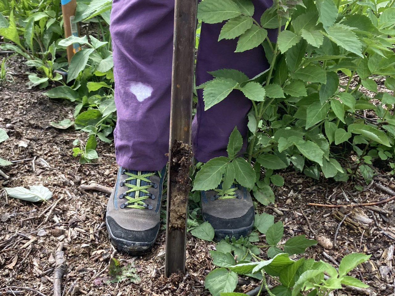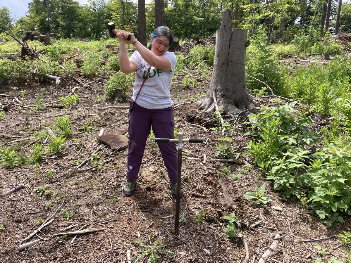 Přešli jsme na další plochu, kde kromě pařezů zůstaly už jen větve. Pavlína Pacová Šimková tu do země zatlouká dutou kovovou tyč a z hloubky necelého metru s její pomocí vytahuje neporušený půdní vzorek. „Zkoumáme obsah živin, obsah uhlíku, případně půdní kyselost,“ vysvětluje.