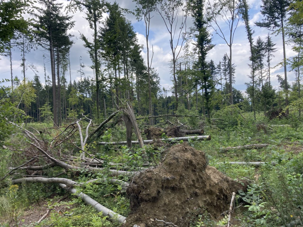 S ředitelem školního lesního podniku Křtiny Tomášem Vrškou se procházíme po lese nedaleko Habrůvky u Brna. 21. června 2024 se tudy prohnala silná vichřice spojená s deštěm a vytvořila zde jakýsi vír, který kácel stromy. Taková kalamita je pro lesníky neštěstí, ale pro vědce příležitost pro výzkum.