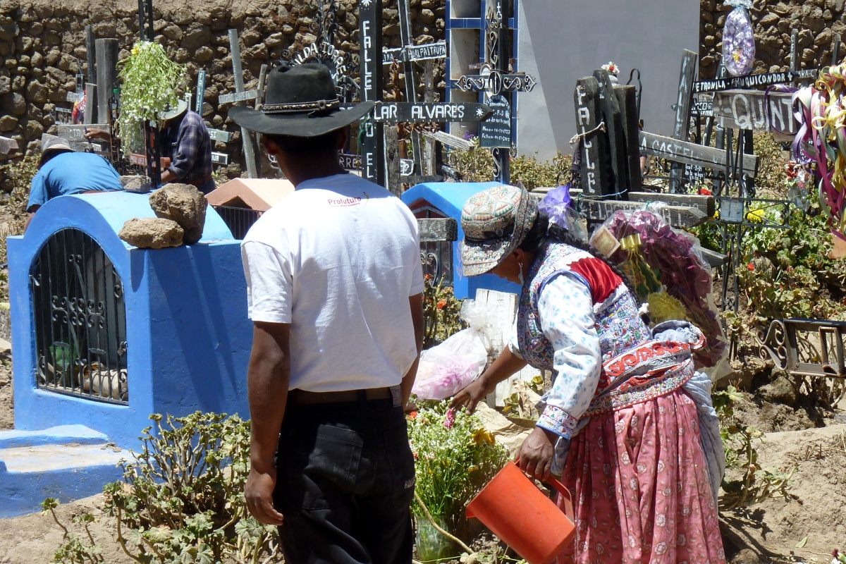 Na všech hrobech svítí světla – na těch starých i na čerstvých, maličkých hrobečcích dětí. Rodiny přinesly jídlo, ovoce a mnoho květin. Pozůstalí hodují a pijí pivo, před hřbitovní zdí se vrší bedny prázdných lahví a muži jsou už pěkně podroušení.
