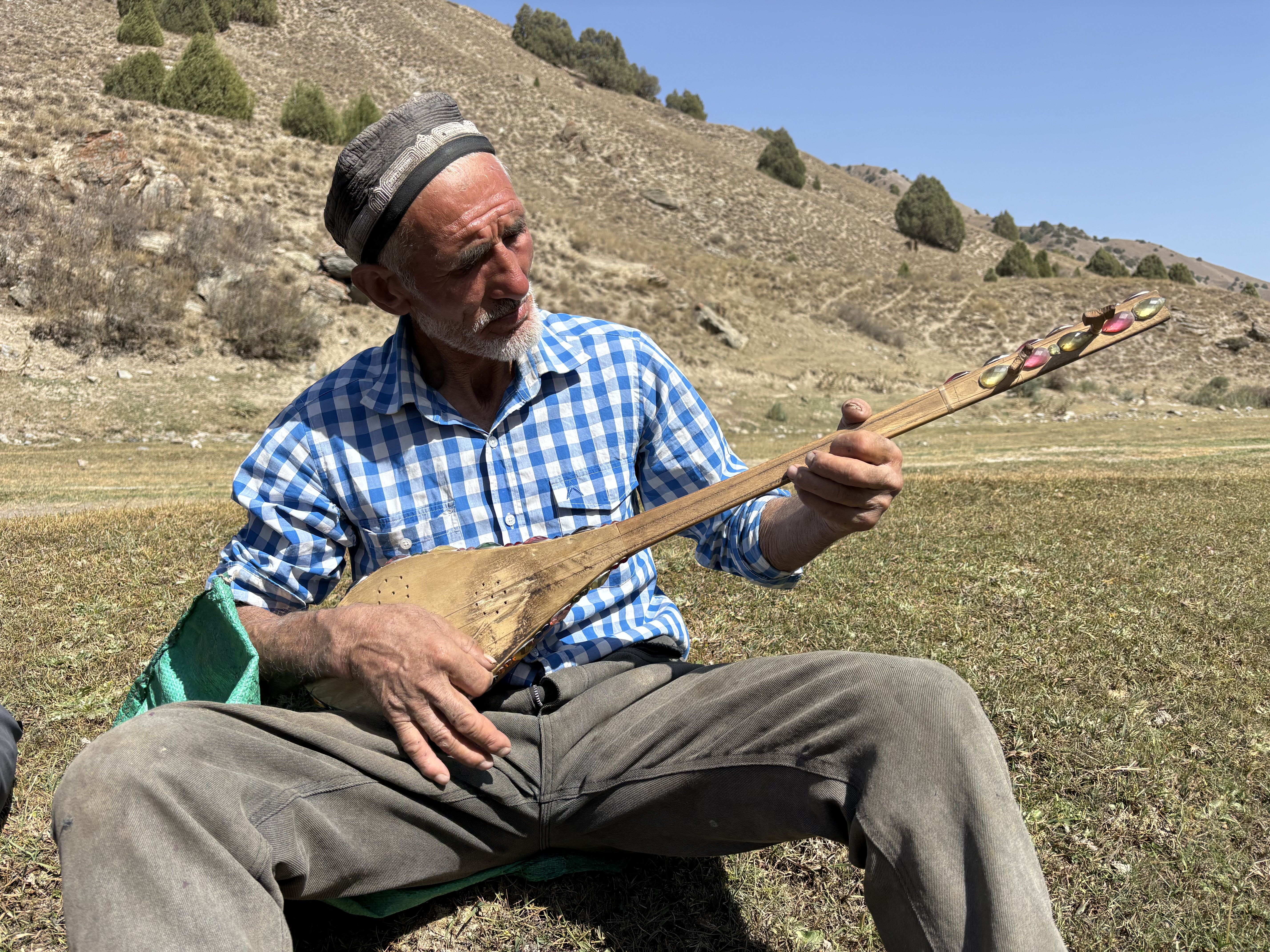 Je osmahlý od ostrého slunce, které tady neúprosně svítí od rána do večera, prsty má rozbité od práce a nadšeně hraje na dvoustrunnou kytaru. „Dáš to internet, na internet?“ ptá se jednoduchou ruštinou a dívá se přitom přímo do objektivu telefonu. „Tádžikistán na internet, tohle údolí, je krásné.“
